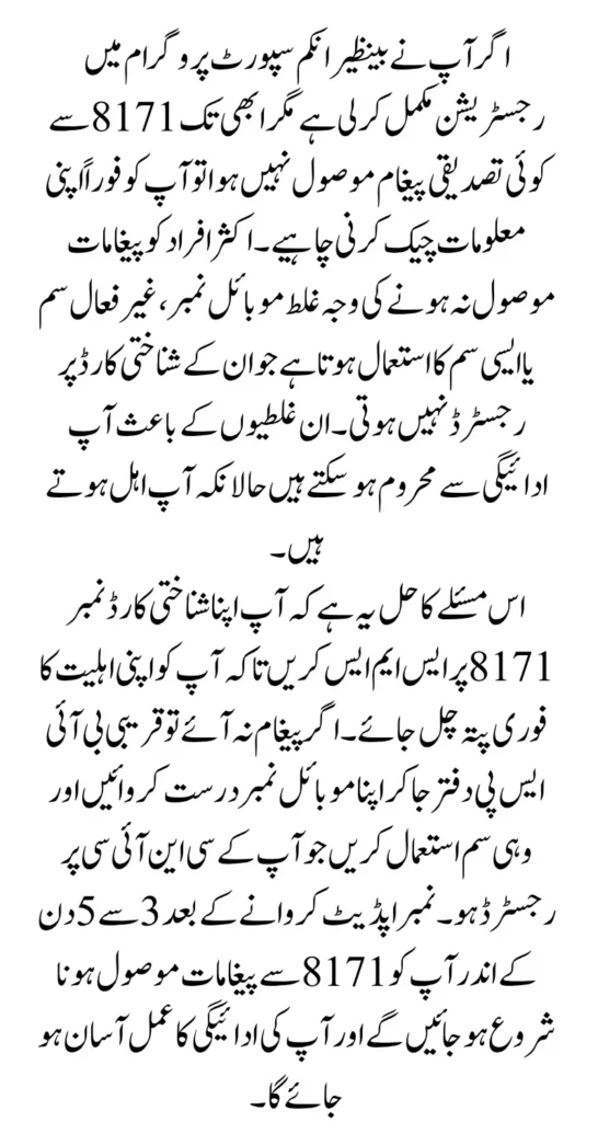 If you’re not receiving the confirmation SMS, you can still manually check your status through the 8171 service using your CNIC. This method is reliable, quick, and available to everyone.