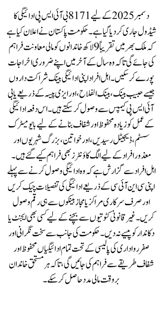 8171 BISP Payment Schedule December 2025 has officially announced the December 2025 payment schedule for 8171 eligible households across Pakistan. This payment is a crucial financial support for low-income families, ensuring that they can meet essential needs before the end of the year. With over 9 million families expected to benefit nationwide, the government has implemented a phased distribution system across provinces to ensure a smooth and transparent process. This initiative highlights the ongoing commitment of BISP to provide timely and efficient assistance to vulnerable households, making the program more accessible and secure than ever before.