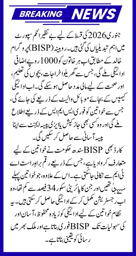 The January 2026 Qist under BISP marks a significant step forward in making social welfare payments more accessible, secure, and efficient. With the Rs 1,000 increase, the shift to mobile wallet payments, and the introduction of BISP cards in Sindh, women no longer need to worry about long queues or delayed payments.