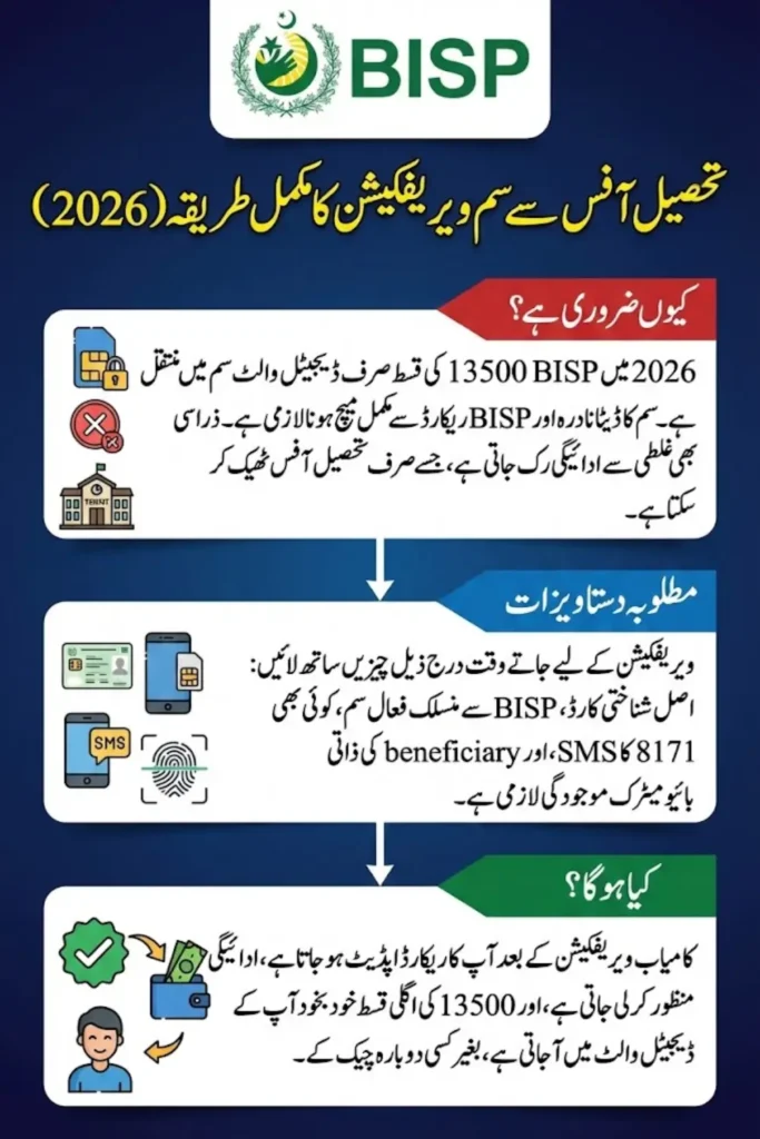 Many payment delays are not due to ineligibility but because the SIM data does not fully match NADRA or BISP records. Even a small mismatch, such as a SIM registered under a different family member, can stop the payment. This is where Tehsil Office verification becomes critical, as it officially resolves these mismatches and restores payment flow.