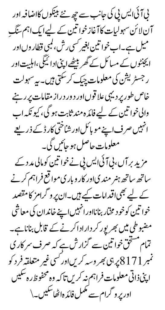 Security and transparency are top priorities for BISP. Women must ensure they only rely on official communication channels to avoid fraud and misuse of their personal information. Any message claiming to offer BISP services from numbers other than 8171 should be ignored. BISP never asks for bank PIN codes, personal passwords, or biometric details via phone calls.