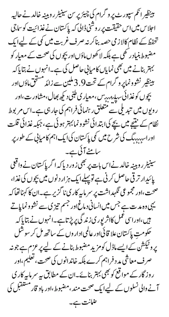 Senator Khalid highlighted that BISP today supports nearly 10 million families, making it one of the largest and most structured social safety nets in Asia. She stated that this scale is not only a sign of administrative capacity but also a reflection of Pakistan’s commitment to human dignity, child development, and national growth. By embedding nutrition support directly into the welfare system, Pakistan has strengthened early childhood outcomes, especially in the most vulnerable communities.