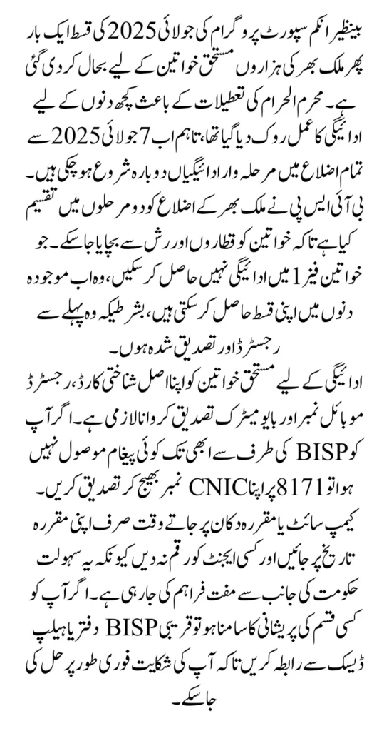 The BISP payment distribution was briefly halted due to the Muharram holidays across the country. Since most government activities slow down during these religious holidays, all BISP payment centers and agent devices were temporarily closed. That meant no one could receive their quarterly installment or complete new registration. However, the good news is that payments have officially resumed from July 7, 2025, and women who couldn’t collect their payment earlier now have another chance.