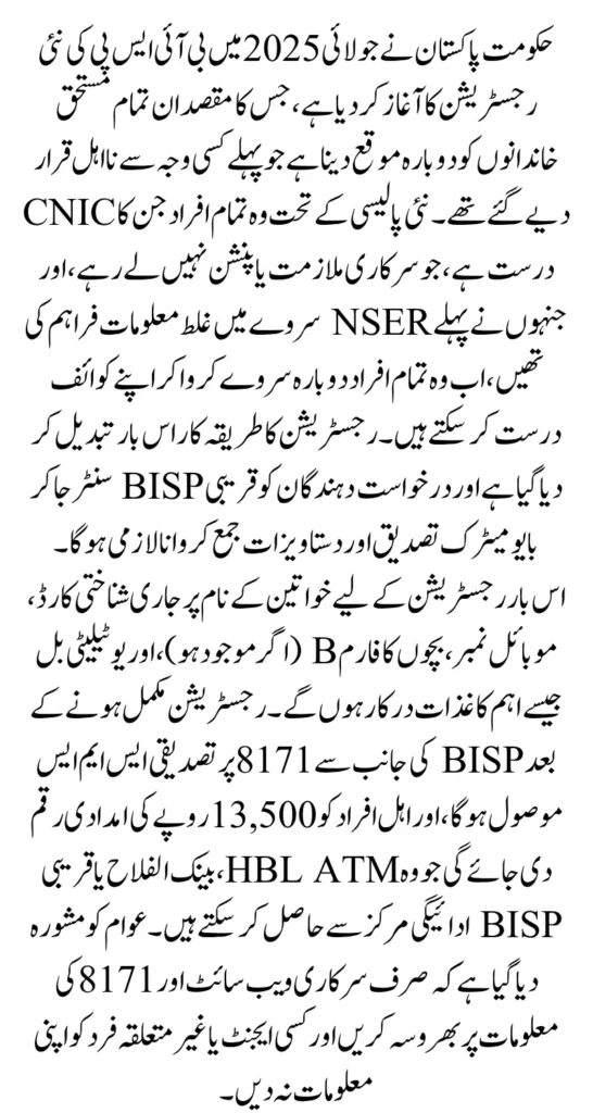 The BISP New Registration July 2025 phase is a renewed hope for those families who were struggling with ineligibility. Whether you were denied due to an expired CNIC, survey mistake, or missing documents, you now have a simple way to fix your record and reapply. With a changed and improved method, the government aims to support deserving families by offering a Rs. 13,500 payment. Just follow the steps, visit your nearest BISP center, and stay informed through official platforms