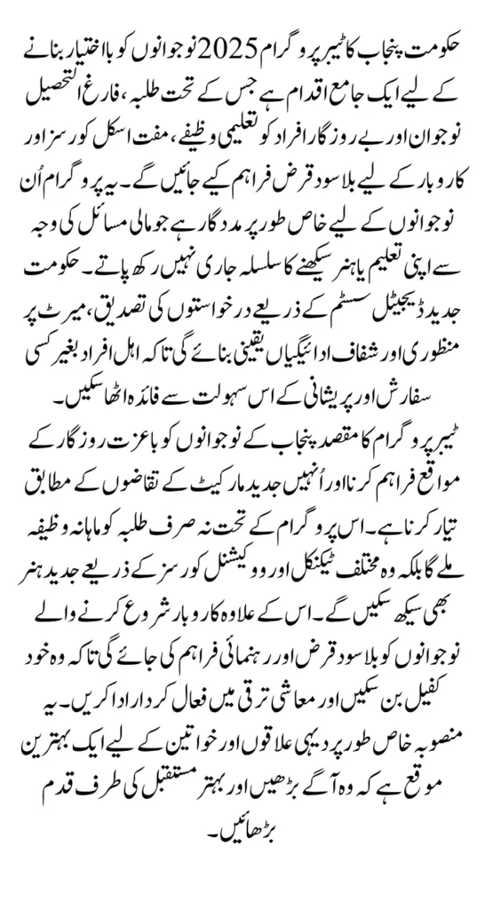 CM Punjab Tabeer Program Details is a powerful youth empowerment initiative launched by the Government of Punjab to support students, fresh graduates, and unemployed individuals in shaping their future. Many talented youth leave education or fail to pursue skill development because of financial limitations and lack of guidance. This program has been designed to eliminate such barriers by offering academic stipends, free skill courses, and business-support loans, making it possible for young people to become productive contributors to society. With this program, the government aims to connect youth with real-world opportunities so they can build sustainable careers and secure a stable financial future.