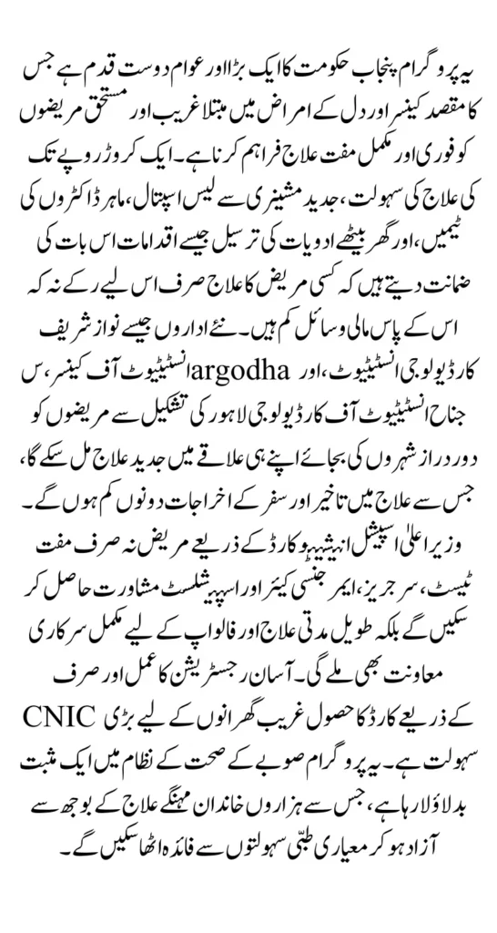 The CM Special Initiative Card is a major healthcare relief program that provides life-saving support to cancer and heart patients across Punjab. By offering up to Rs. 1 million in free treatment, establishing new specialized institutes, and strengthening healthcare infrastructure, the government has laid the foundation for an accessible and modern health system.