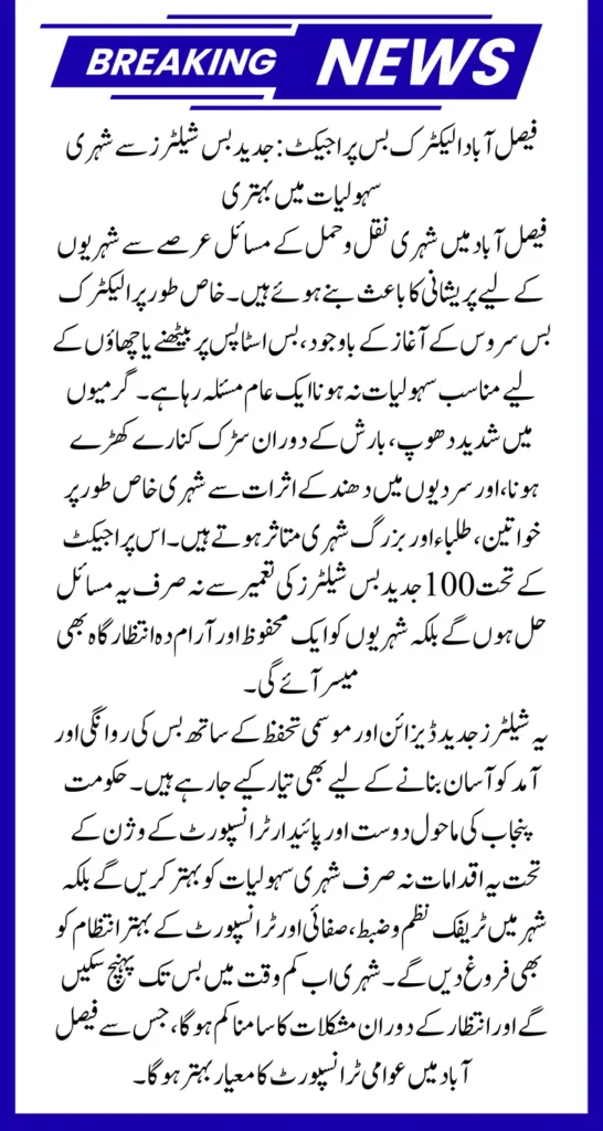 Faisalabad Electric Bus Project is one of Pakistan’s busiest cities, where thousands of people depend on public transport every day to reach factories, markets, offices, colleges, and hospitals. Despite the introduction of electric buses, commuters have continued to face problems due to the lack of proper waiting facilities. In extreme heat, rain, or winter fog, standing on open roads has been a daily hardship for citizens, especially women, senior citizens, and students.
