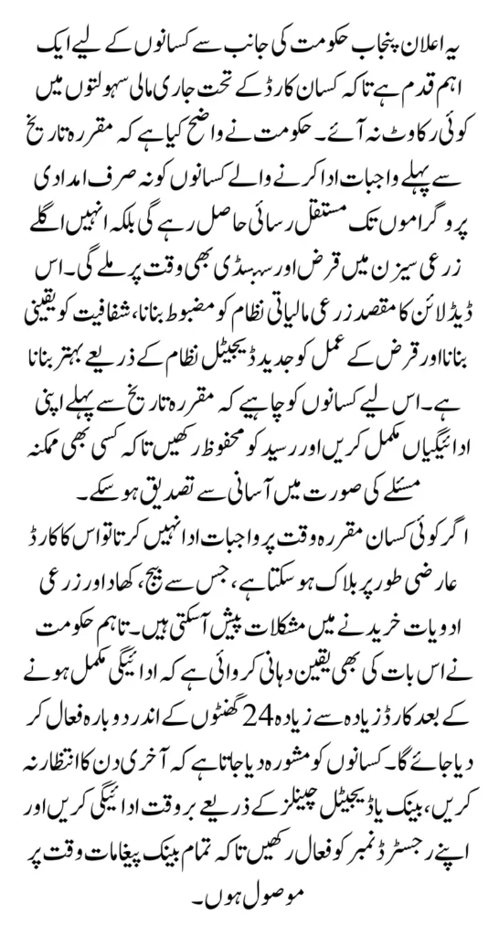 Farmers who fail to clear dues by the final date will face temporary suspension of loan facilities and subsidy access. Since the system is automated, the card will stop working and no manual intervention will be possible without payment. This can cause problems during crop preparation time because the farmer may not be able to instantly purchase vital inputs. In addition, delayed payment may trigger verification of land records and CNIC to ensure transparency, which could slow down reactivation in some cases.