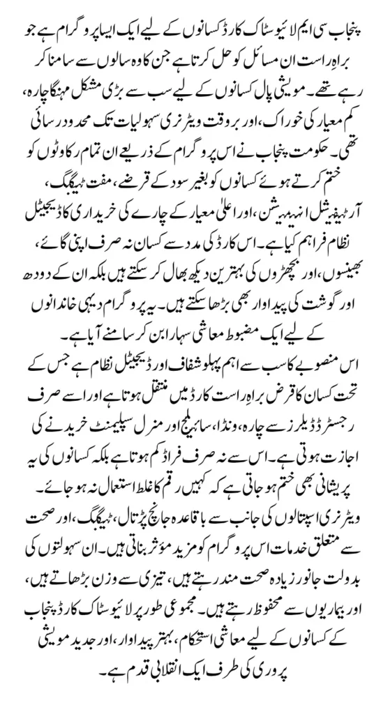 The Punjab CM Livestock Card offers a powerful combination of interest-free loans, modern veterinary services, and digital access that helps farmers improve animal health and secure better incomes. With its transparent process, easy application method, and strong focus on nutrition, the program stands as one of the most effective livestock initiatives in the province. Farmers who meet the eligibility criteria should take advantage of this opportunity to enhance their livestock management and benefit from the government’s support for sustainable rural development.