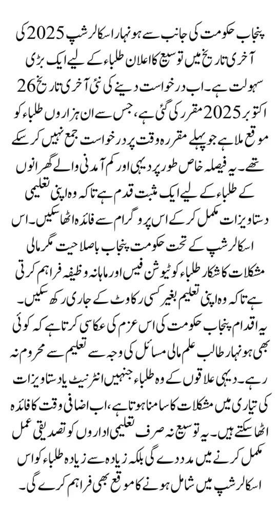 The extension of the Honhaar Scholarship 2025 deadline is a thoughtful and student-friendly step by the Punjab Government. It provides equal opportunity for thousands of deserving students to apply and secure financial aid that can transform their educational journey. The program not only covers academic expenses but also supports living and transport costs, making education accessible for every hardworking student across Punjab.