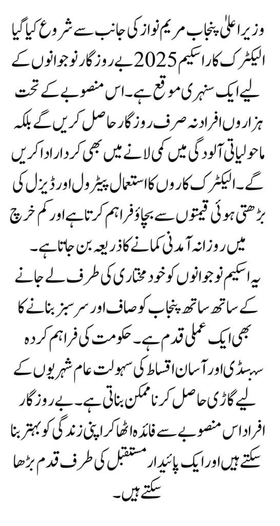 The Punjab Government has launched the CM Punjab Electric Car Scheme 2025 under the leadership of Chief Minister Maryam Nawaz. This scheme has been designed to support unemployed citizens by offering them an opportunity to own an electric car with government-backed financial support. It is a part of the larger Green and Clean Transport Vision which focuses on eco-friendly development in Punjab. By providing electric cars, the government is addressing two challenges at once — creating new income opportunities for jobless people and reducing environmental pollution caused by fuel-based vehicles.