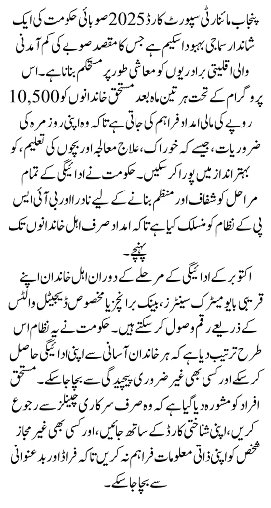 Punjab Minority Support Card 2025 Punjab Government continues to strengthen its welfare system with the launch of the Punjab Minority Support Card 2025, a special program aimed at helping low-income minority families. Under this scheme, families will receive Rs. 10,500 every quarter, and in October, the payment withdrawal phase has officially begun. The initiative is part of Chief Minister Maryam Nawaz’s vision to promote equality and provide financial protection to marginalized groups.