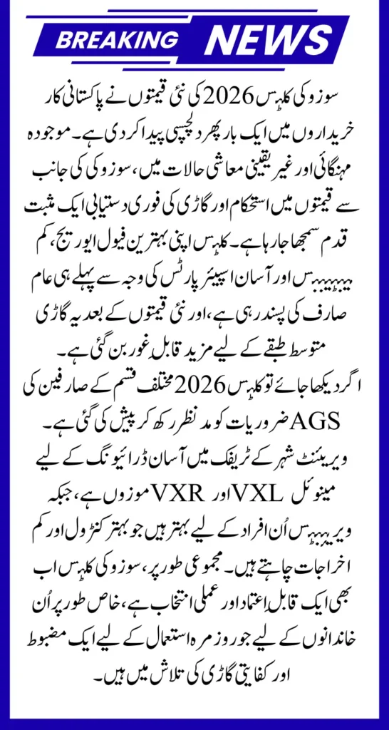 Suzuki Cultus 2026 Prices Drop has once again caught the attention of car buyers by announcing updated prices for the Suzuki Cultus 2026. In a market where prices usually move upward, this revision has been received positively, especially by middle-class families who rely on affordable hatchbacks for daily use. Over the years, Cultus has built a reputation as a reliable, fuel-efficient, and easy-to-maintain car, which is why every update related to it creates strong interest.