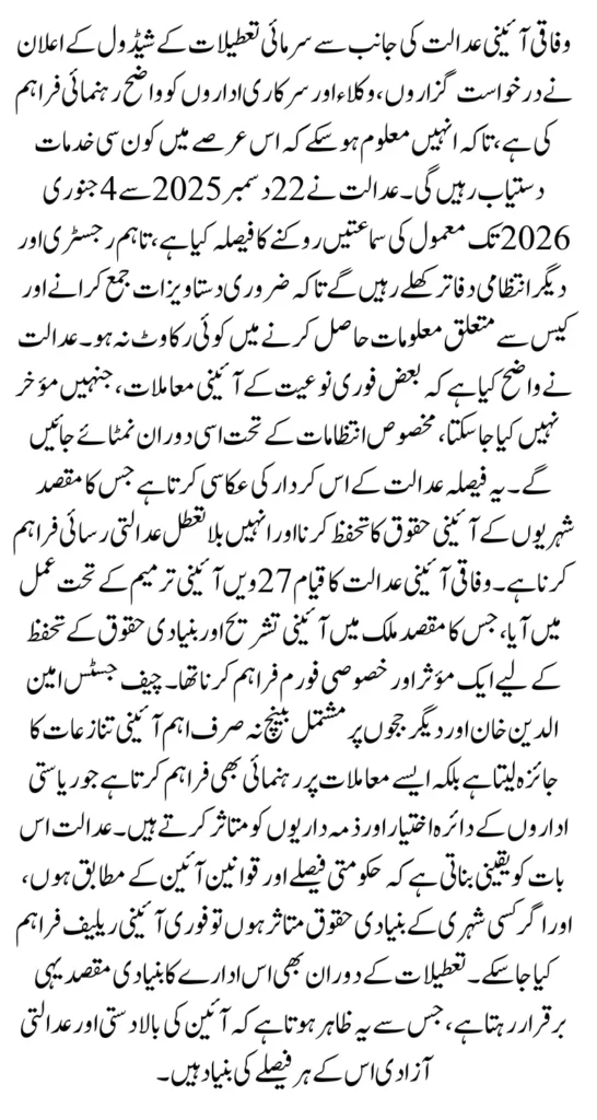 Winter Vacation Schedule For December Federal Constitutional Court (FCC) has officially released its winter vacation schedule, confirming that the court will not hold regular hearings from December 22, 2025, to January 4, 2026. This announcement provides timely clarity for petitioners, lawyers, government departments, and all stakeholders who rely on the court for constitutional matters. Although routine judicial proceedings will pause during this period, the FCC has ensured that administrative work will continue so that no essential process is stalled. By maintaining operational offices, the court aims to balance annual vacation needs with uninterrupted access to constitutional services.